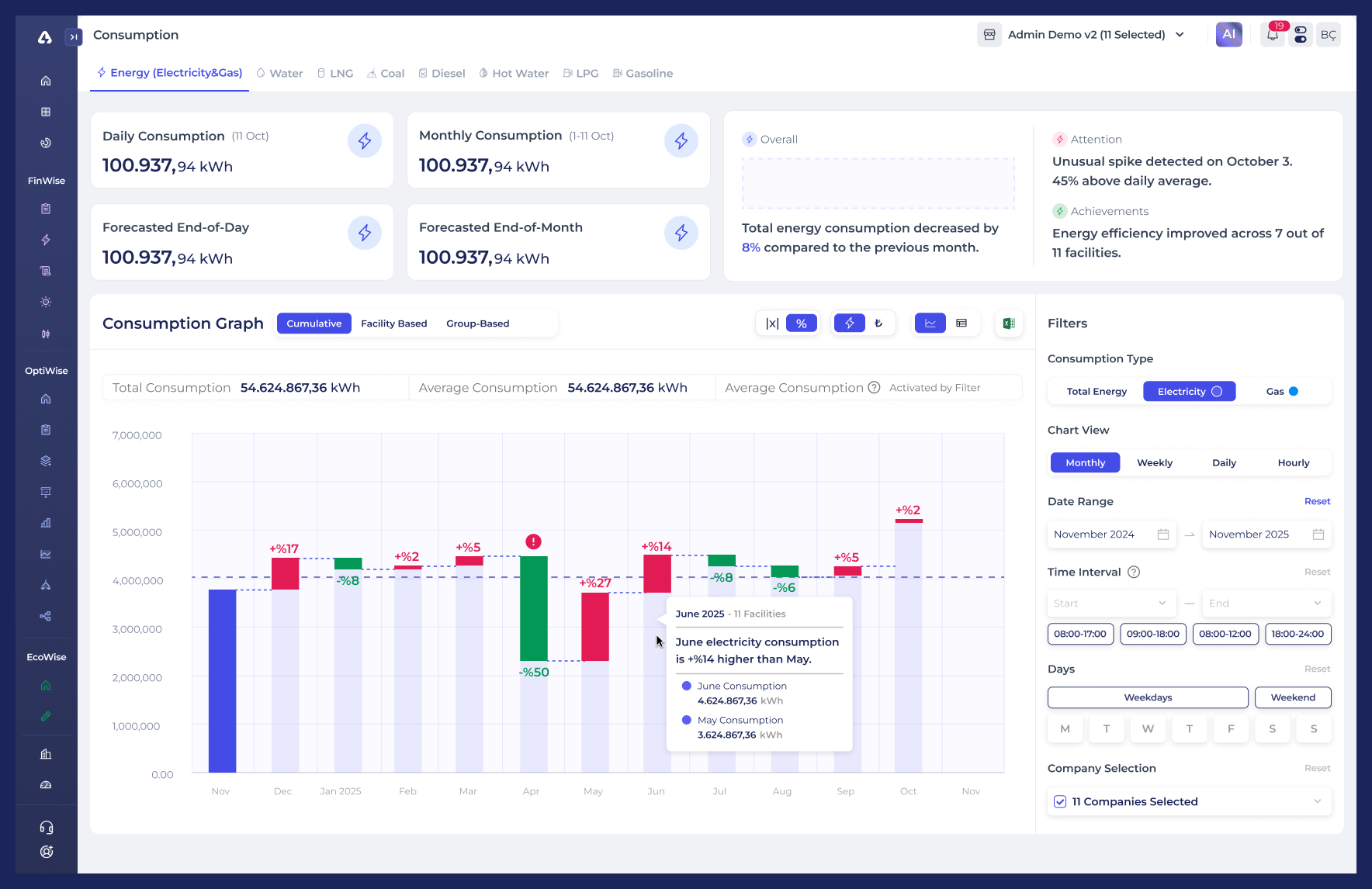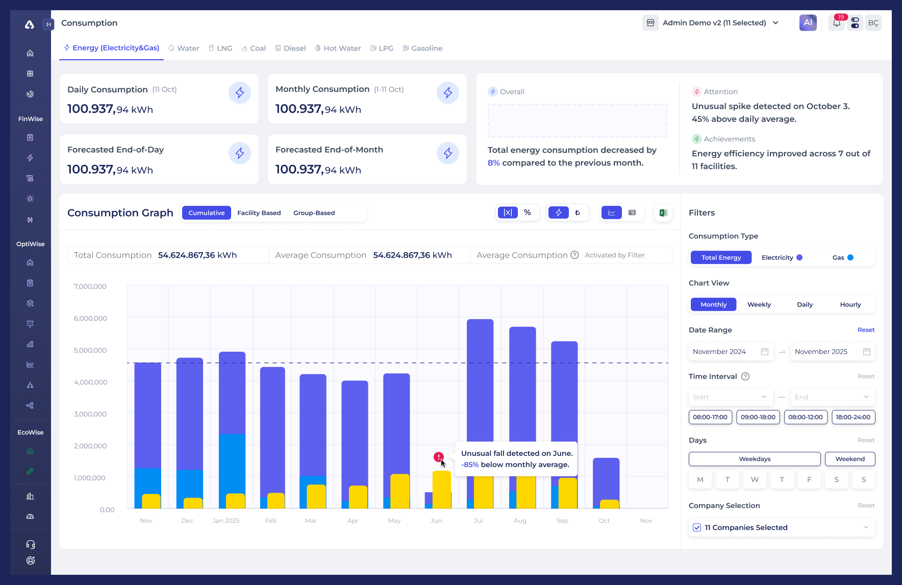 Key improvements include a more distinct separation between KPIs and charts, a structured filtering model for energy type, time range, and company selection, and a primary data view toggle (Cumulative / Facility / Group) that clearly defines how consumption is aggregated.