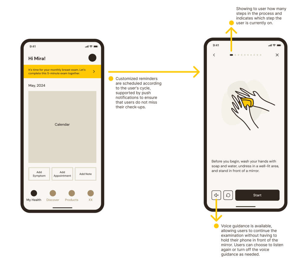 My first instinct was to question the need for a standalone app for a single purpose. Instead, I proposed integrating the breast self-exam as a feature within a broader menstrual and wellness companion app. This would increase engagement, build user trust, and better align with AURA’s holistic approach to care.