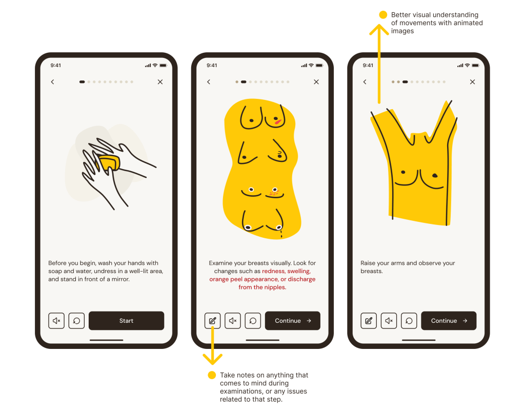 AURA is developing a mobile app focused on supporting breast self-exams to promote early detection and offer a trusted space for users to take charge of their health. I was asked to envision the design of this app.
