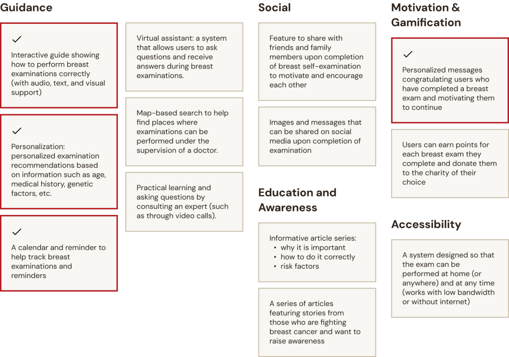 I explored solutions under three themes: guidance, motivation, and accessibility. I prioritized ideas that were technically feasible, empowering, and easy to integrate into users’ existing routines.