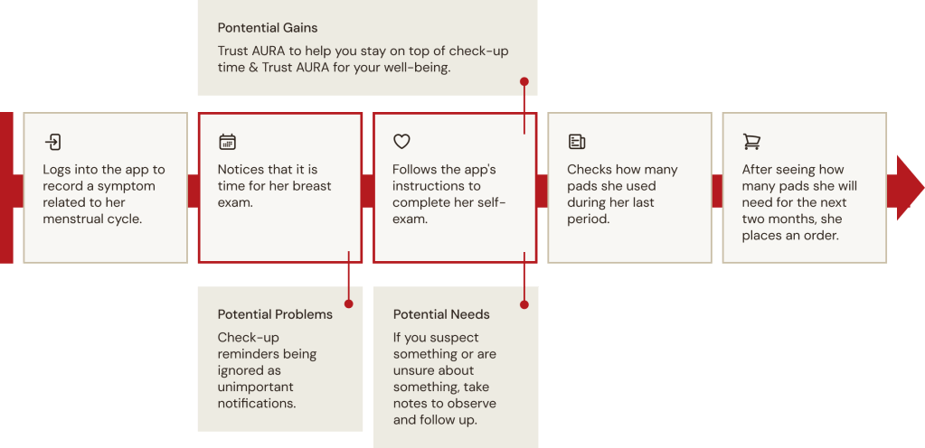 Knowing the importance of the subject, I concluded that it would be more practical to focus this issue as a supporting feature for an application serving different purposes so that it better aligns with AURA’s holistic approach to women’s health & care and it can effectively reach the right audience.