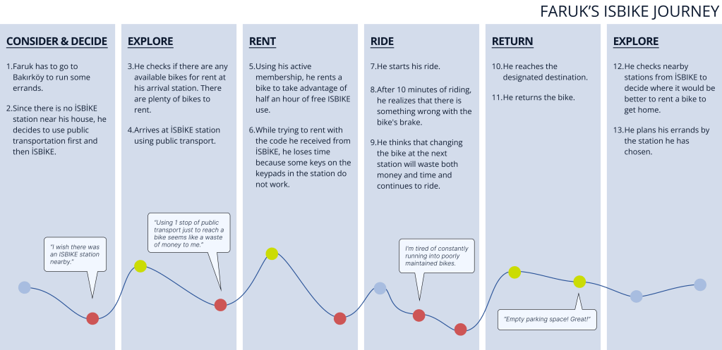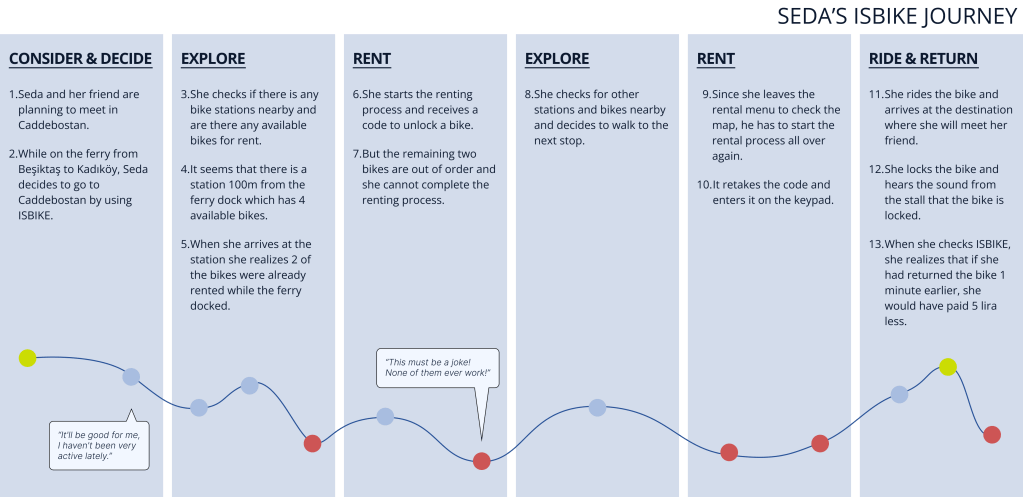 This exercise helped me understand the missing parts of the users current experience and what they felt during their journey of using the ISBIKE. It also guided me to which points of the user’s journey that I should focus on.