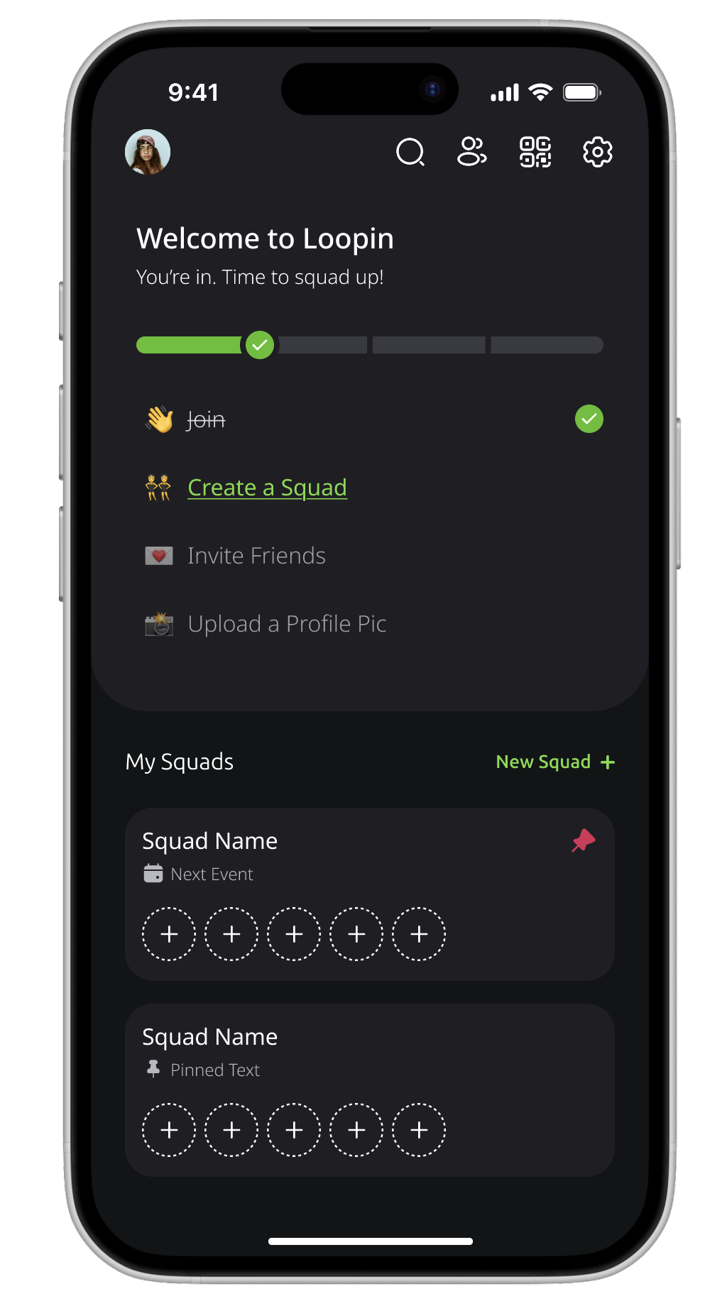 Dropping users into a blank homepage often leads to confusion and early abandonment. To prevent this, I designed a structured first-time view with clear starting actions and imaginative empty states. The top section provides simple “first steps” for getting set up, while the lower section visualizes what squads will eventually look like. This helps users picture the value before they create anything.