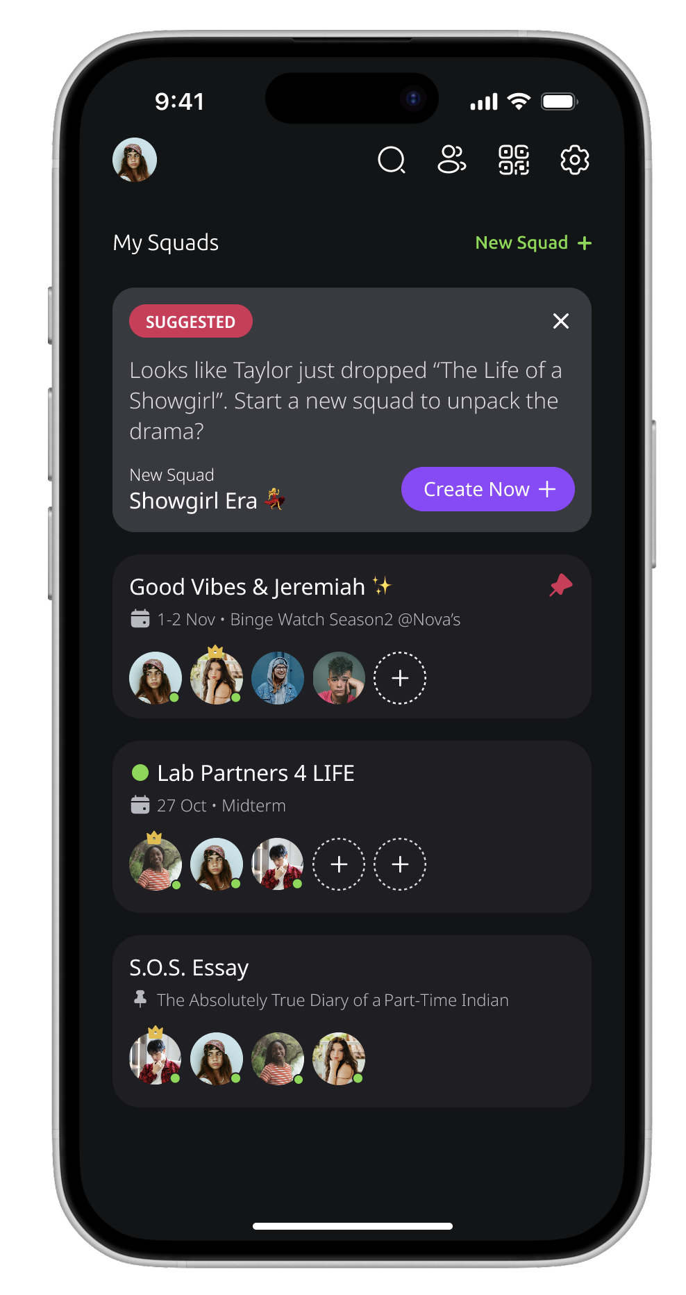 For active users, the homepage evolves into a lively hub powered by ongoing squad activity. Instead of showcasing every feature, the design focuses on surface-level momentum like upcoming squad plans, pinned highlights, suggestions based on daily trends, and playful cues about squad creators. The goal is to make the home feel alive, personal, and socially magnetic.
