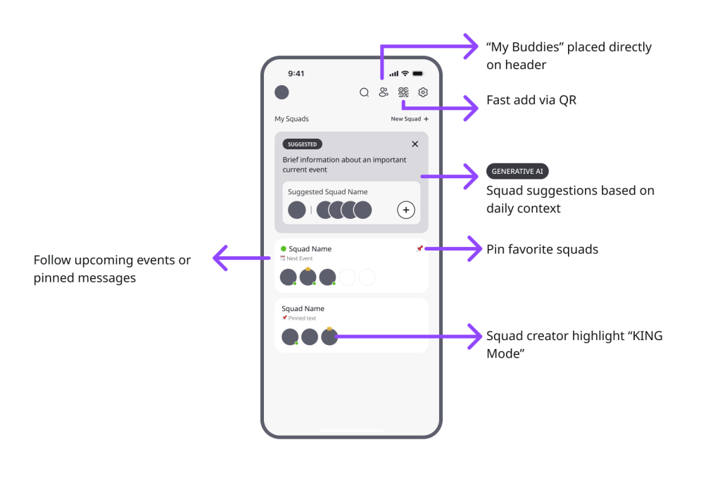 The challenge was to move beyond traditional chat app conventions and design something powered by Generative AI elements that reflect each squad’s shared vibe.