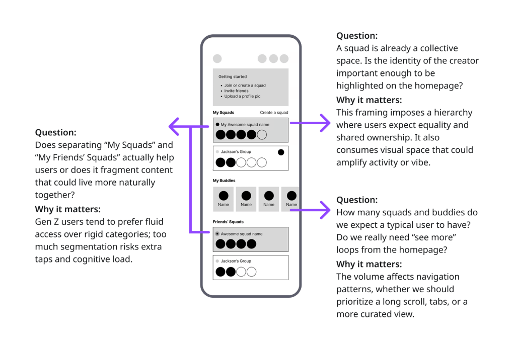 Before proposing any design direction, I started by evaluating the initial wireframe delivered by the PM. My goal in this phase was to understand how well the suggested structure aligned with the product vision: enabling Gen Z & Gen Alpha users to stay connected with their closest friends throughout the day.